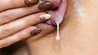 French_skinny gets fucked on the table by her stepbrother. Her cooter ended up dripping with cum